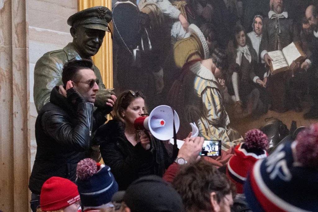 After entering the Capitol, Gold and Strand moved to Statuary Hall where Gold attempted to give her speech on medical freedom. Following police intervention pushing the crowd out, they relocated to the Great Rotunda where Gold delivered her speech using a bullhorn from the platform of a statue of Gen. Dwight D. Eisenhower.